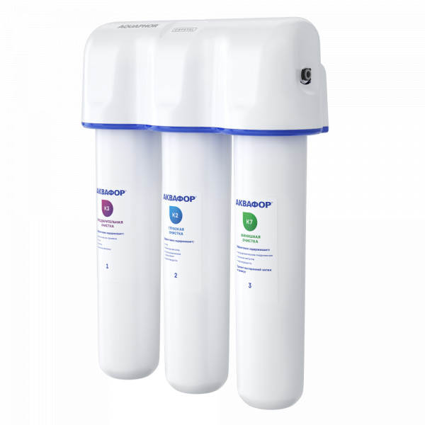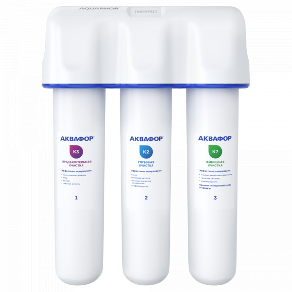 Три картриджа последовательно очищают воду от видимых механических примесей и растворенных вредных веществ. Блок предварительной очистки К3 задерживает частицы размером от 5 микрон, модуль глубокой очистки К2 – от 3 микрон. Третий модуль К7 обеспечивает финишную очистку от частиц до 0,8 микрон (что в 125 раз тоньше человеческого волоса). Карбонблок с Акваленом захватывает и надежно задерживает тяжелые металлы и другие опасные примеси, которые чаще всего встречаются в водопроводной воде.